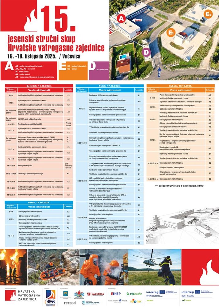 Hrvatska vatrogasna zajednica, u suradnji s Vatrogasnom zajednicom županije Splitsko-dalmatinske, Javnom ustanovom Vatrogasni centar za edukaciju i tehnološki razvoj Split-Vučevica i Centrom za edukaciju i tehnološki razvoj u vatrogastvu, a u partnerstvu s Vatrogasnom zajednicom Baden-Württemberg, organizira 15. jesenski stručni skup Hrvatske vatrogasne zajednice, koji se održava od 16. do 18. listopada 2025. godine.Ovaj trodnevni skup bit će prilika za demonstraciju brojnih vatrogasnih specijalnosti koje su ključne za obavljanje vatrogasne djelatnosti: od spašavanja iz dubina i visina, ispitivanja fizičke spremnosti, hot fire treninga, ventilacije na strukturnim požarima do gašenja požara na helikopteru.